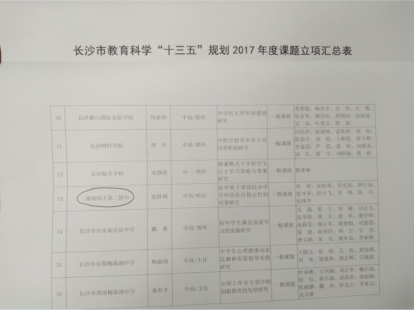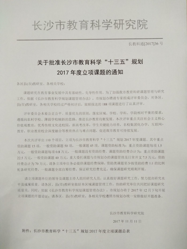 近日,长沙市教育科学“十三五”规划2017年度课题立项名单出炉,我校张胜利校长主持的课题——《新形势下增强民办中学师资队伍稳定性的对策研究》通过了专家评审委员会的严格评审,获准立项。这是我校第一个市级教育科学规划课题,它的成功立项既是对我校科研工作和科研能力的肯定,也必将促进我校教育教学质量的大幅提升和教师专业化发展的长足进步。